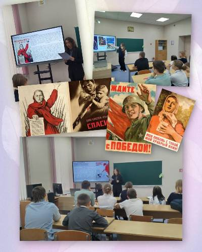 Учащиеся 7 класса познакомились с плакатами времён Великой Отечественной войны. Ребята вместе с руководителем по ВПВ разбирались в их предназначении, разнообразии, цветовом решении, узнали имена известнейших авторов, создававших шедевры плакатного искусства.